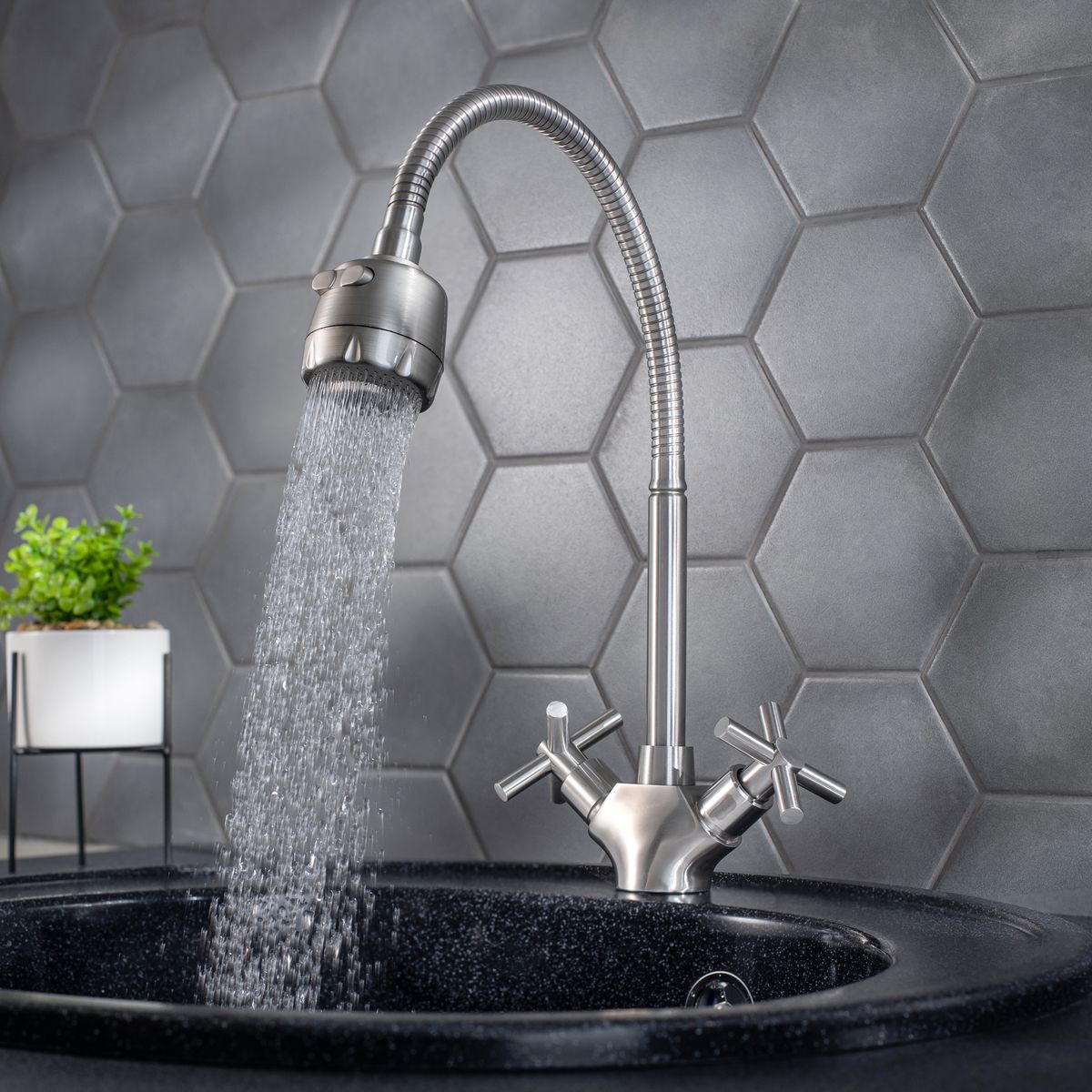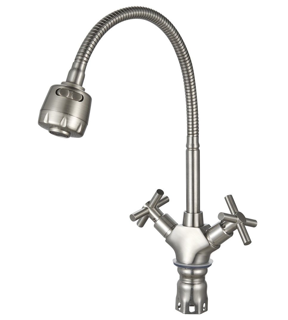 Функциональный двуручковый смеситель для кухни с гибким изливом и насадкой распылителем станет не заменимым помощником на кухне.