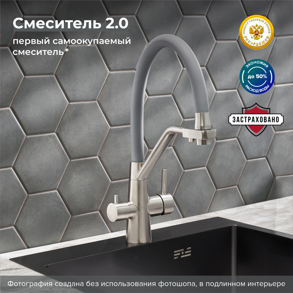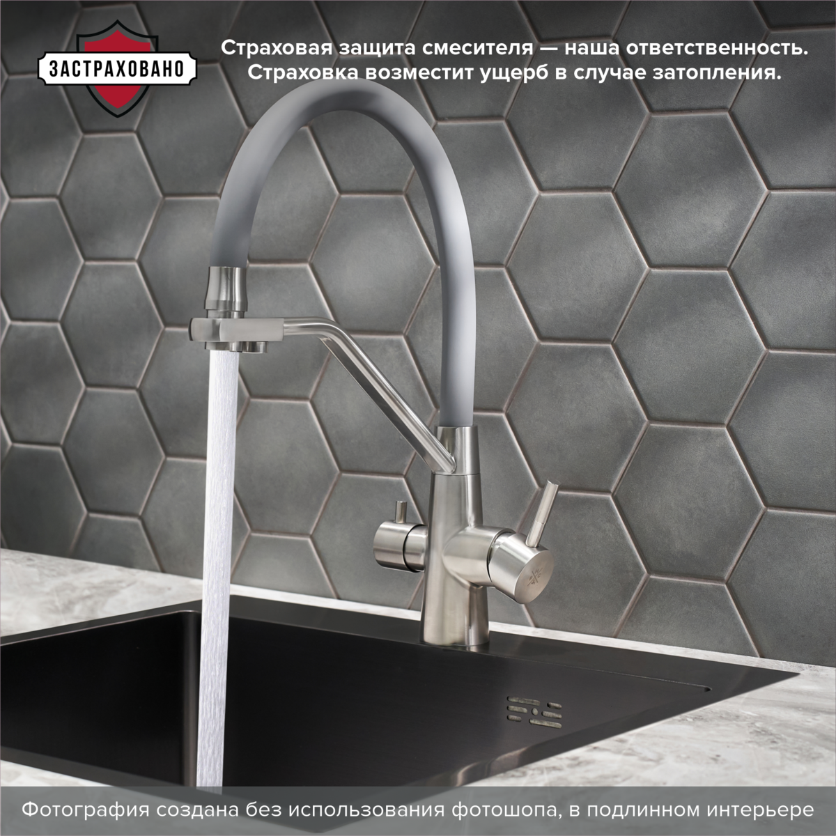 Смеситель для кухни с переключением фильтра для питьевой воды с высоким поворотным изливом.