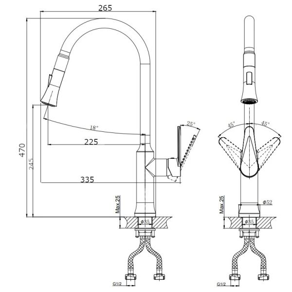 Смеситель для кухни RUSH арт. DN0335-23 с поворотным изливом и вытяжной лейкой из коллекции Denis с металлической ручкой, изготовлен из высококачественной латуни и имеет рычажное управление. В смеситель установлен картридж D-35 с керамическими пластинами. Высота смесителя 486 мм. Излив поворотный 225 мм. Высота излива до аэратора 245 мм. Аэратор изготовлен из пластика с нержавеющим корпусом, угол наклона аэратора-18гр. В комплекте универсальная присоединительная группа для установки на горизонтальную поверхность, гибкая подводка с латунными гайками 40 см - 2шт, фум-лента, индивидуальный пакет, паспорт, гарантийный талон.