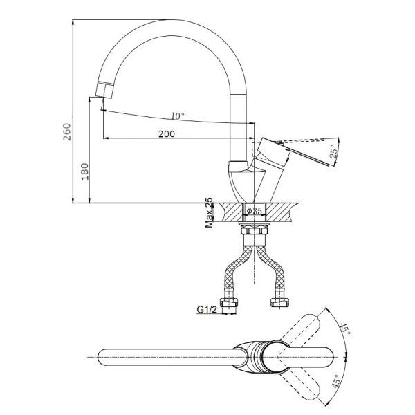 Смеситель для кухни RUSH арт. TE2835-22 с поворотным изливом с металлической ручкой из коллекции Tenerife изготовлен из высококачественной латуни и имеет рычажное управление. В смеситель установлен картридж D-35 с керамическими пластинами. Высота смесителя 260 мм. Излив поворотный 200 мм. Высота излива до аэратора 180 мм. Аэратор изготовлен из пластика с нержавеющим корпусом, угол наклона - 10 гр. В комплекте универсальная присоединительная группа для установки на горизонтальную поверхность, гибкая подводка с латунными гайками 40 см - 2шт, фум-лента, индивидуальный пакет, паспорт, гарантийный талон.