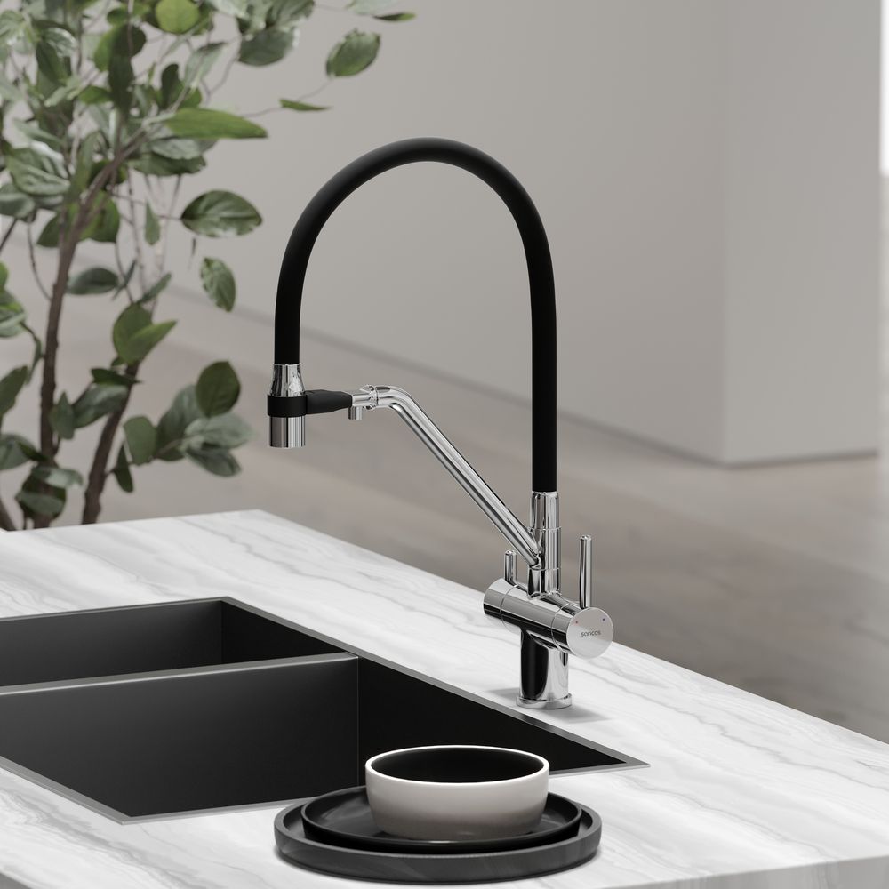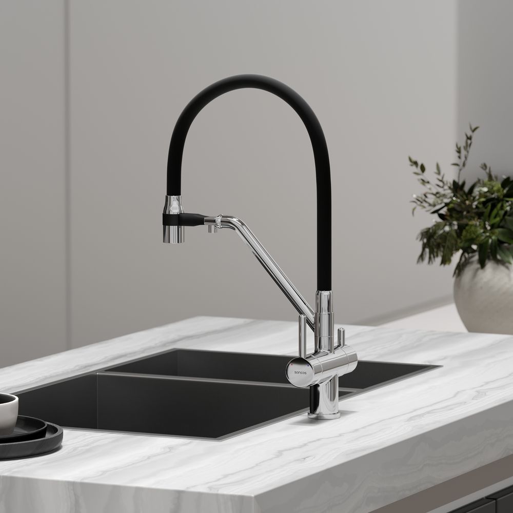 Смеситель для кухни SANCOS Dora с гибким изливом и возможностью подключения фильтра для воды, цвет хром, арт. SC4003CHС возможностью регулировки температуры водыАэратор, гибкая подводка, ключ и крепления для монтажа