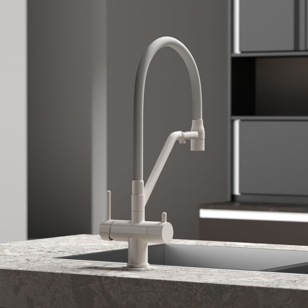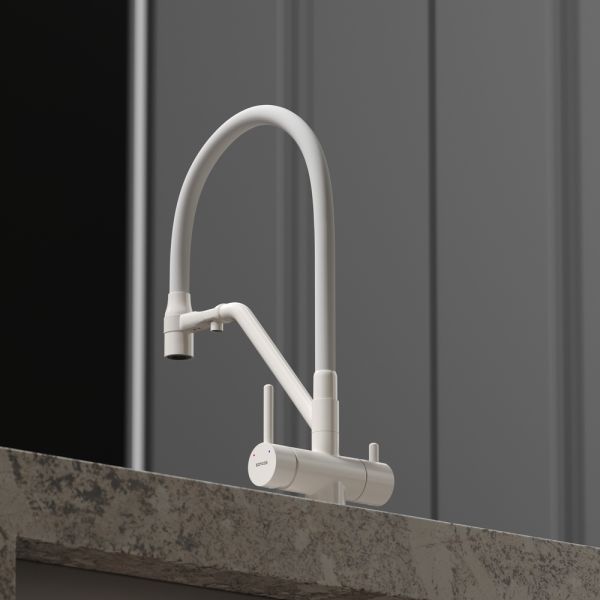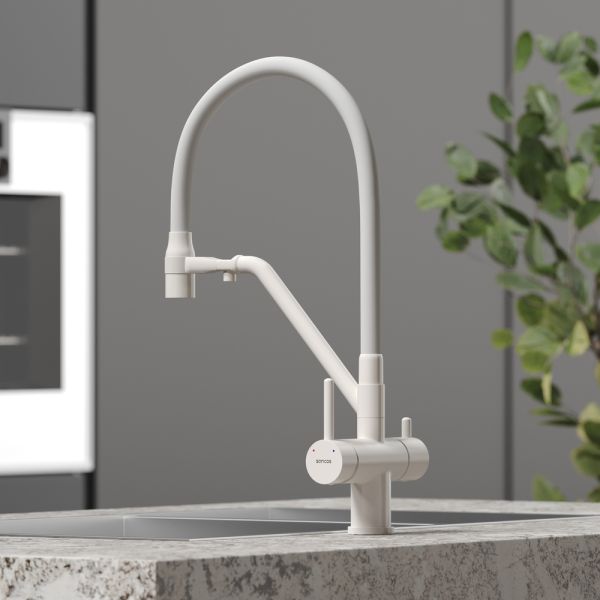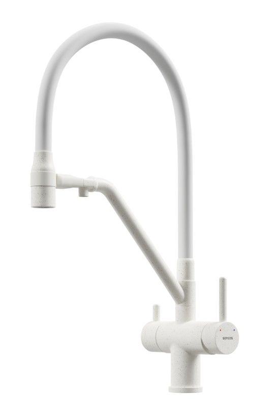 Смеситель для кухни SANCOS Dora с гибким изливом и возможностью подключения фильтра для воды, цвет матовый белый, арт. SC4003MWС возможностью регулировки температуры водыАэратор, гибкая подводка, ключ и крепления для монтажа