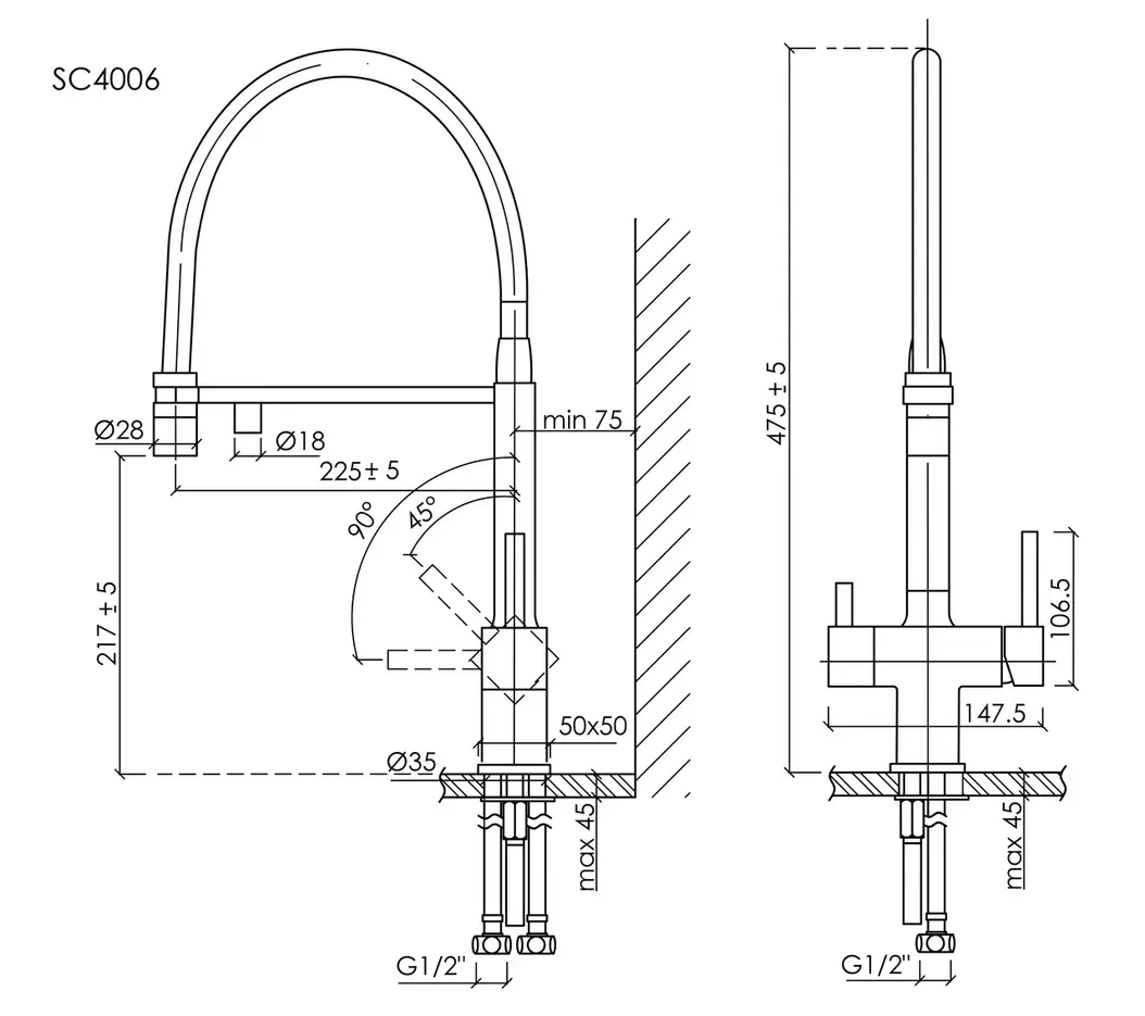 • Высота смесителя: