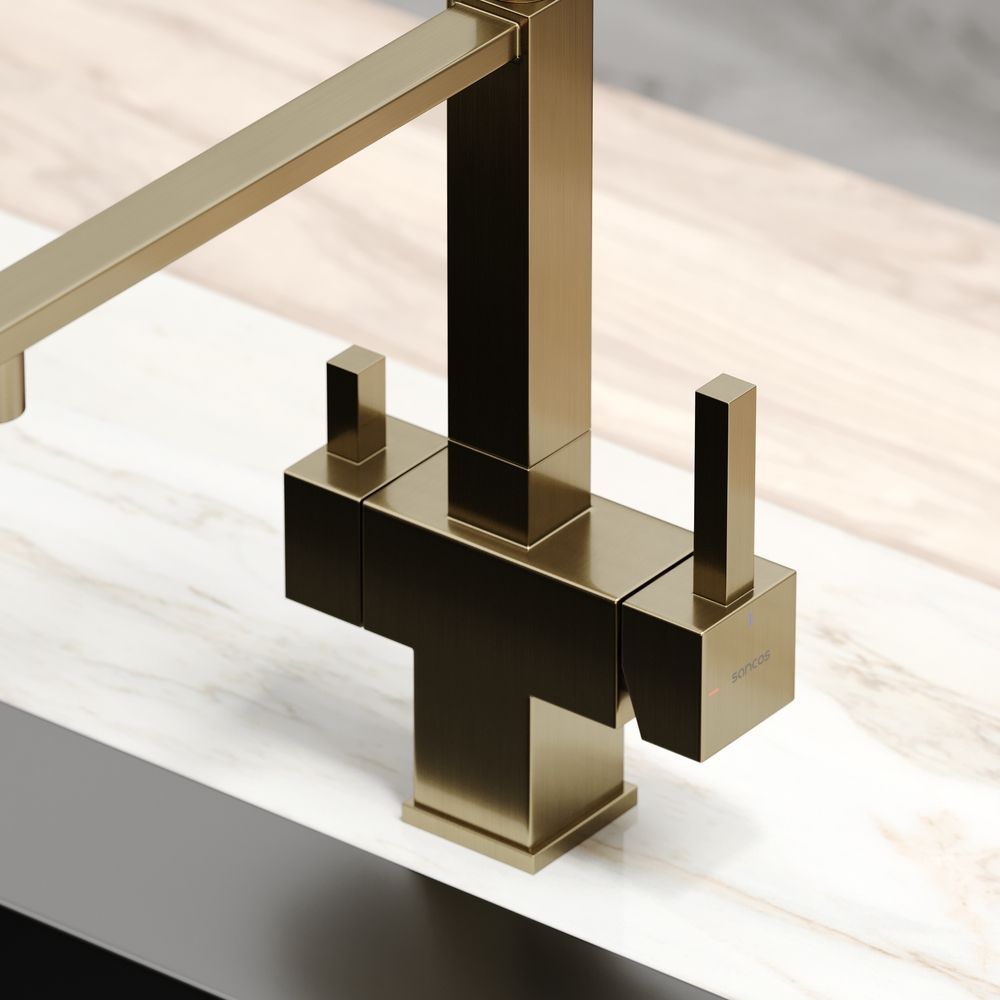 Смеситель для кухни SANCOS Moro с гибким изливом и возможностью подключения фильтра для воды, цвет брашированное золото, арт. SC4006BGФункция "Холодный старт" - при включении смесителя активируется холодной поток, для экономии горячей водыАэратор, гибкая подводка, ключ и крепления для монтажа