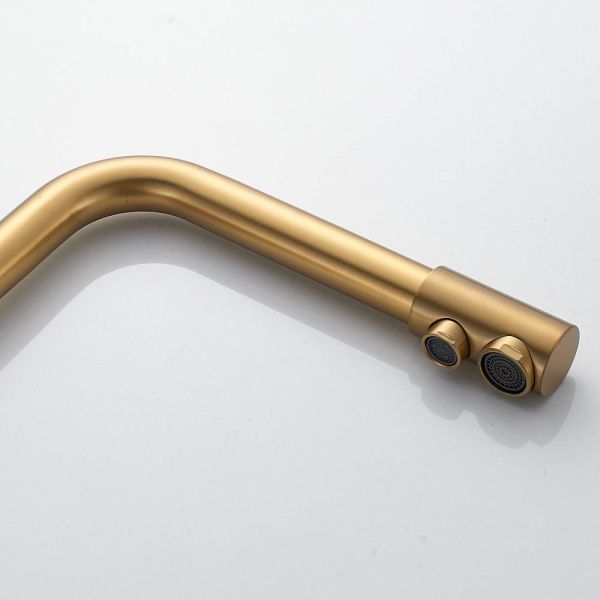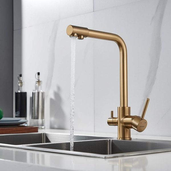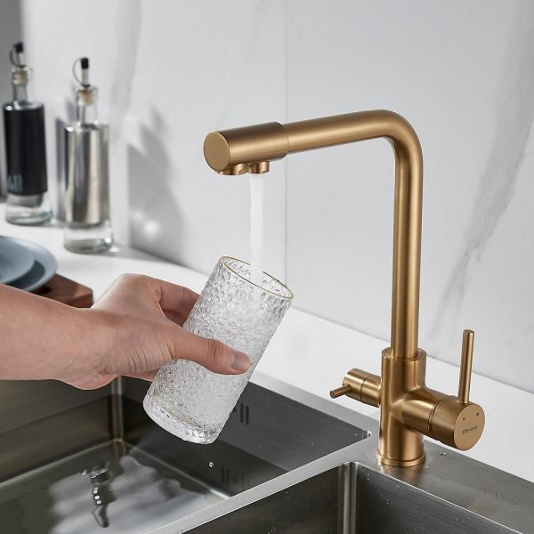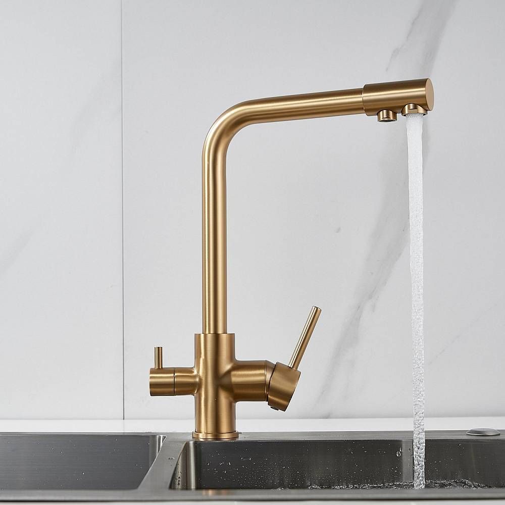 Во-первых, цвет "золотой сатин" подойдет к любому дизайну кухни и будет гармонично смотреться в любом интерьере. Во-вторых, поворотный излив позволит легко настроить струю воды под любые ваши нужды, а встроенный канал для питьевой воды облегчит процесс фильтрации и подачи воды.