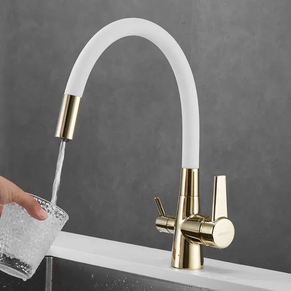 Смеситель для кухни с гибким изливом и подключением фильтра Shevanik S668E, золото/белый.Управление: рычажное.Вращение излива: да.Выдвижной излив: нет.Гибкий излив: да.Высота:33,5.