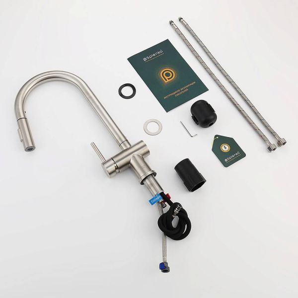 Смеситель для кухни с выдвижным изливом Splenka S204.49.05. Цвет: сатин. Смеситель для кухни с выдвижным изливом из нержавеющей стали. Излив смесителя оснащен аэратором, что обеспечивает экономичный расход воды. Излив поворотный и выдвижной. Механизм смесителя: керамический картридж. Управление рычажное. Подводка гибкая 1/2. Режимы лейки: 2. Данная модель отличается своей долговечностью и хорошим качеством.
