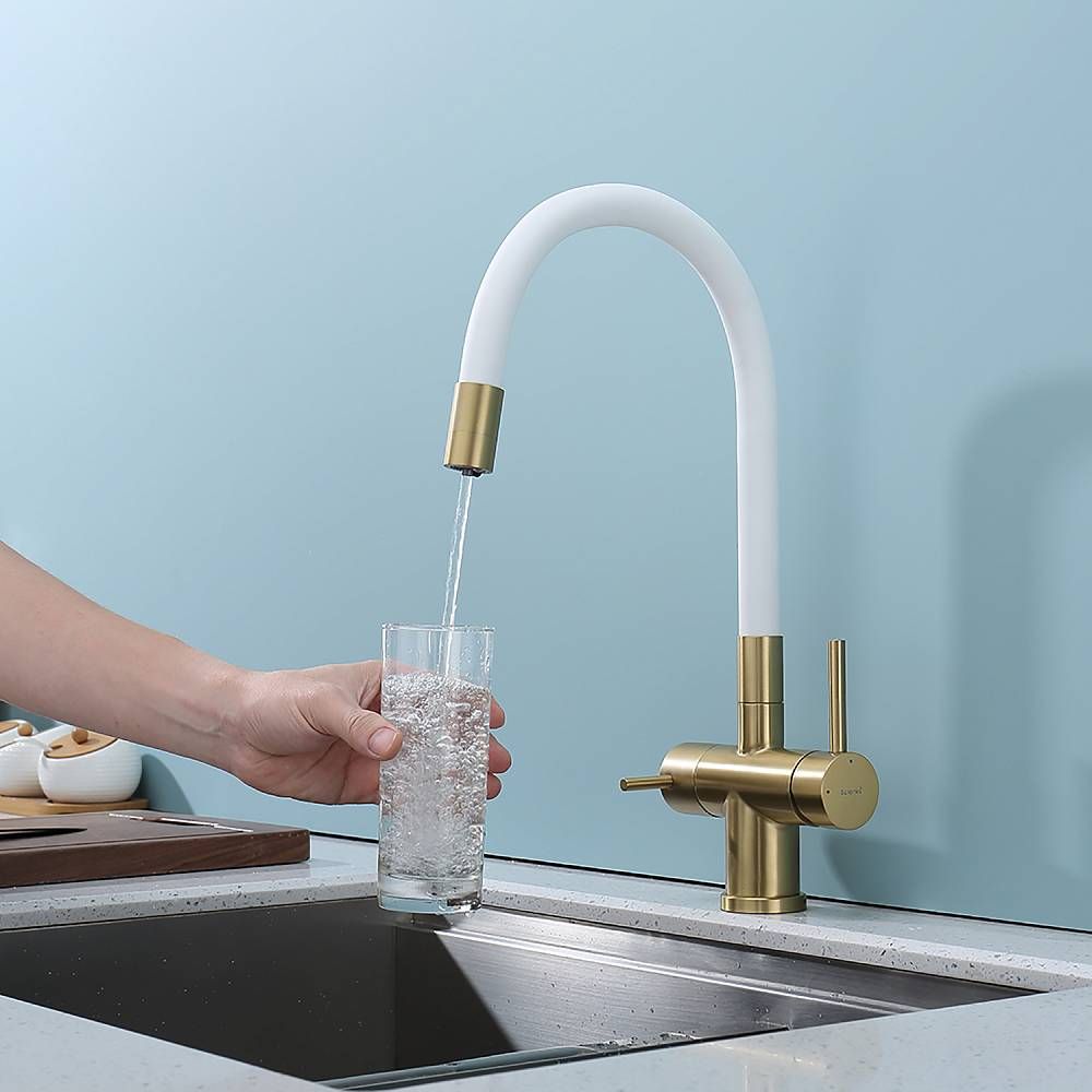 Смеситель для кухни с подключением к фильтру питьевой воды Splenka S70.64.03. Цвет: сатин золотой. Гибкая подводка 50 см идет в комплекте. Благодаря грамотно разработанной конструкции, прибор отлично справляется с регулированием температуры и напора потоков воды. Однорычажные смесители максимально удобны при эксплуатации, всего одним движением руки можно закрыть или открыть воду, имеют стильный внешний вид, а также комфортность в использовании. Гарантия 5 лет.
