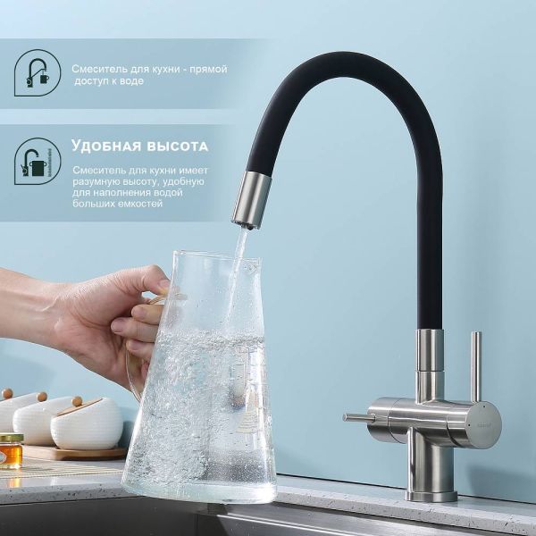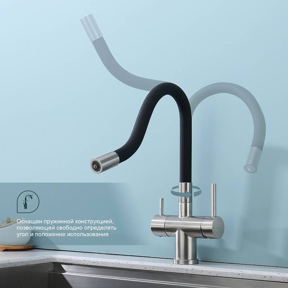 Смеситель для кухни с подключением к фильтру питьевой воды Splenka S70.64.05. Цвет: сатин. Гибкая подводка 50 см идет в комплекте. Благодаря грамотно разработанной конструкции, прибор отлично справляется с регулированием температуры и напора потоков воды. Однорычажные смесители максимально удобны при эксплуатации, всего одним движением руки можно закрыть или открыть воду, имеют стильный внешний вид, а также комфортность в использовании. Гарантия 5 лет.