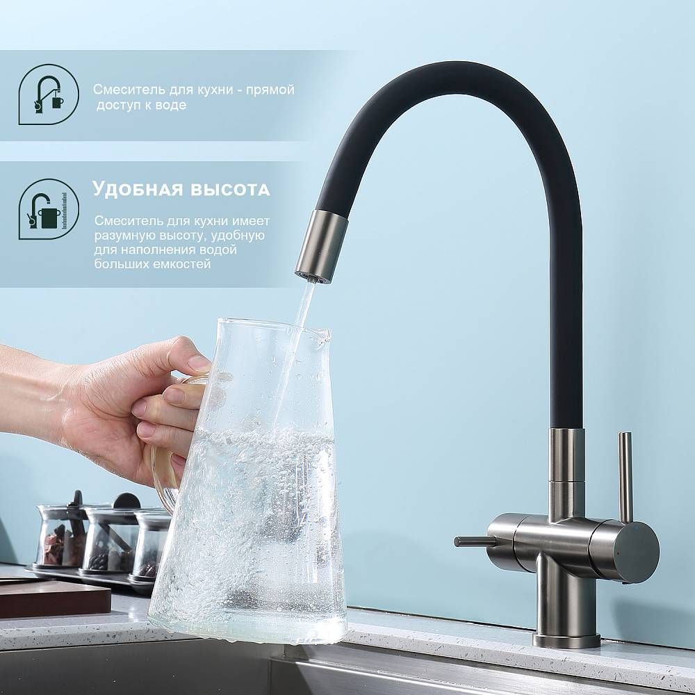 Смеситель для кухни с подключением к фильтру питьевой воды Splenka S70.64.09. Цвет: графит. Гибкая подводка 50 см идет в комплекте. Благодаря грамотно разработанной конструкции, прибор отлично справляется с регулированием температуры и напора потоков воды. Однорычажные смесители максимально удобны при эксплуатации, всего одним движением руки можно закрыть или открыть воду, имеют стильный внешний вид, а также комфортность в использовании. Гарантия 5 лет.