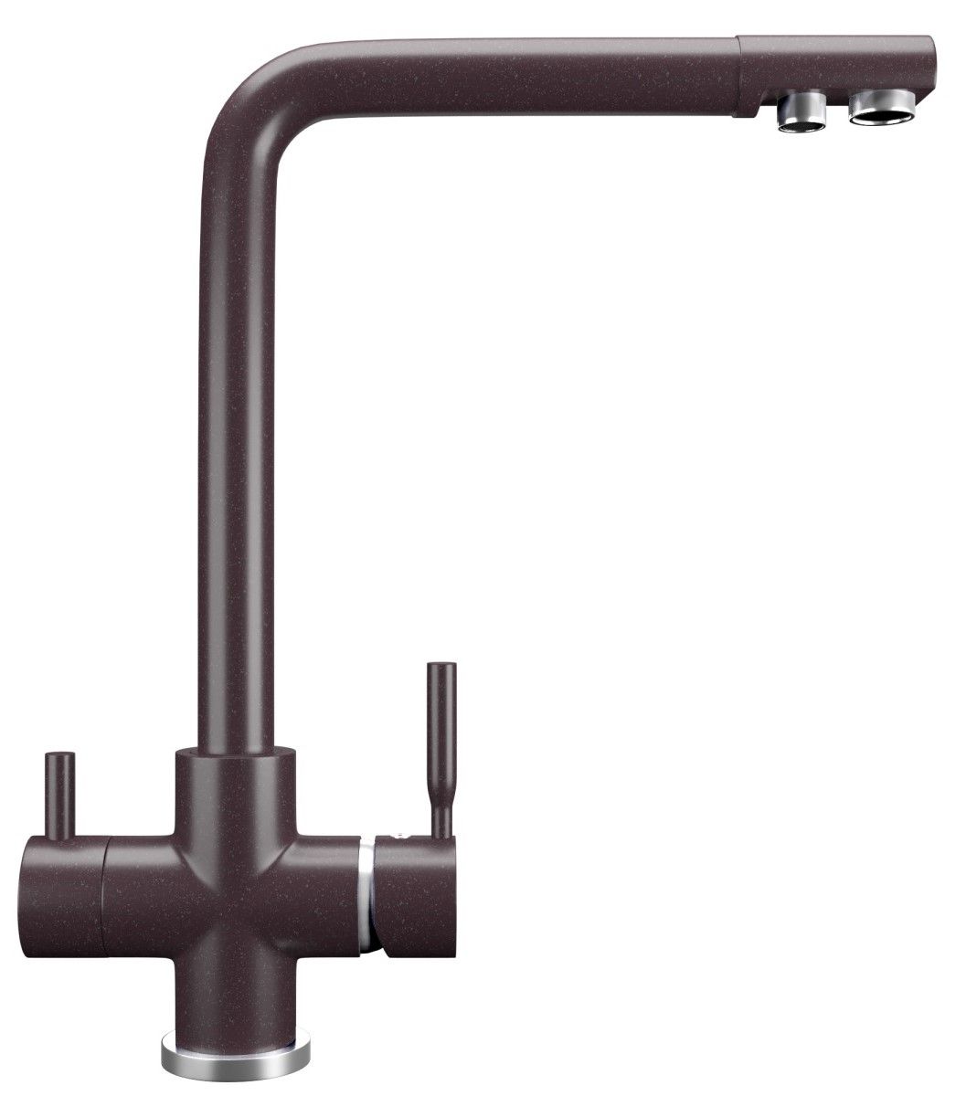 Высокоэргономичный кухонный смеситель с дополнительным краном для подключения фильтрованной воды, оснащенный кран-буксой с керамическими пластинами. Реализован тройной подвод воды через один излив: холодная, горячая и фильтрованная. Переход с одного подвода на другой производится поворотом рычага. Набор для соединения с фильтром входит в комплект. Система фильтрации приобретается дополнительно и монтируется под мойку, специальный индикатор сообщает о необходимости замены картриджа. Материал корпуса выполнен из высококачественной латуни, а окрашивание под искусственный камень в цвет мойки ULGRAN выполняется на собственном производстве, что позволяет идеально попасть в фирменный цвет ULGRAN. В качестве керамического картриджа используется известный бренд Wanhai диаметром 35 мм с высокой пропускной способностью в 500 тысяч циклов открывания-закрывания. На подвижные части картриджа Wanhai нанесена специальная невымываемая силиконовая смазка, а керамические пластины изготовлены из 96 процентов оксида алюминия, что, в сочетании с высоким качеством шлифовки обеспечивает долговечность, надежность, плавность хода рукоятки. Смеситель оборудован съемным пластиковым аэратором для экономии воды и поворотным изливом на 360 градусов. В комплектацию входят: керамический картридж Wanhai, гибкая подводка, комплект крепежных элементов, кран-букса с керамическими пластинами для дополнительного излива для фильтрованной воды, набор для подсоединения фильтра питьевой воды (гибкая подводка + переходник-цанга), технический паспорт и гарантийный талон.