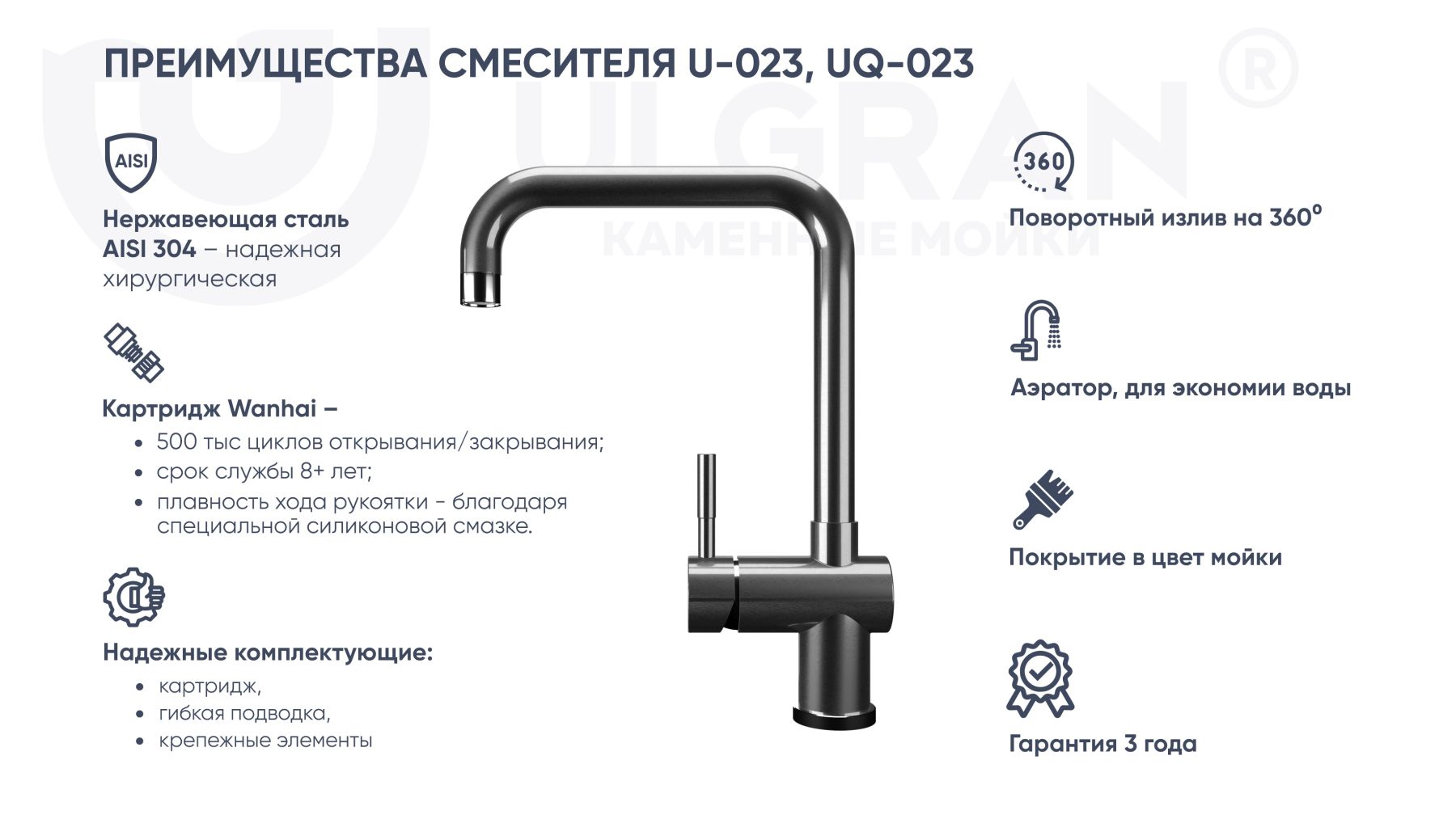 Смеситель ULGRAN U-023 – это удобный современный кухонный смеситель с высоким поворотным изливом. Материал корпуса выполнен из высококачественной нержавеющей стали марки AISI 304, а окрашивание под «искусственный камень», в цвет мойки ULGRAN выполняется на собственном производстве, что позволяет идеально попасть в фирменный цвет ULGRAN. В качестве керамического картриджа используется известный бренд Wanhai диаметром 40 мм с высокой пропускной способностью в 500 тысяч циклов «открывания-закрывания». На подвижные части картриджа Wanhai нанесена специальная невымываемая силиконовая смазка, а керамические пластины изготовлены из 96% оксида алюминия, что, в сочетании с высоким качеством шлифовки обеспечивает долговечность, надежность, плавность хода рукоятки. Смеситель оборудован съемным пластиковым аэратором для экономии воды и поворотным изливом на 360 градусов. В комплектацию входят: керамический картридж Wanhai, гибкая подводка 450 мм, комплект крепежных элементов, технический паспорт и гарантийный талон. Заводская гарантия составляет 3 года на материал корпуса, 1 год на комплектующие к смесителю и 1 год на материал покрытия.