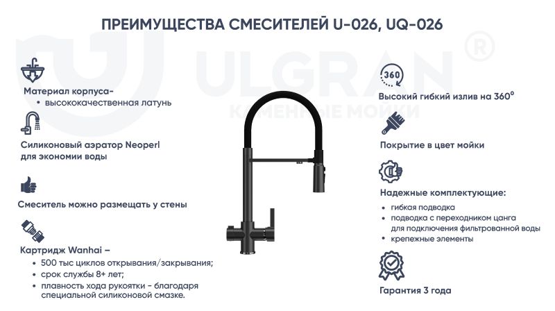 Смеситель ULGRAN U-026 – это стильный современный кухонный смеситель с высоким гибким изливом черного цвета. Материал корпуса выполнен из высококачественной латуни, сверху корпус смесителя покрыт хромом.