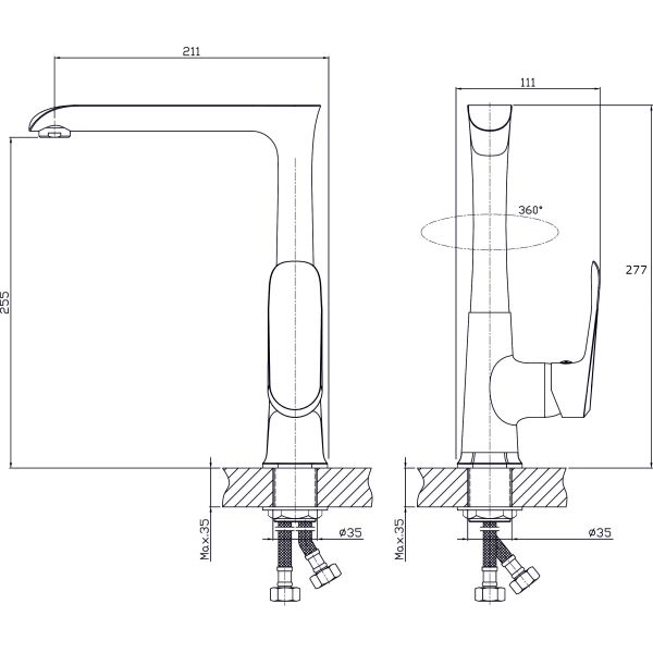Смеситель для кухни с высоким поворотным изливом RUSH арт. GZ3735-23 с металлической ручкой из коллекции Gozo изготовлен из высококачественной латуни и имеет рычажное управление. В смеситель установлен картридж D-35 с керамическими пластинами. Высота смесителя 277 мм. Излив поворотный, 211 мм. Высота излива до аэратора 255 мм. Аэратор изготовлен из пластика с нержавеющим корпусом. В комплекте гибкая подводка с латунными гайками 35 см - 2шт, универсальная присоединительная группа, фум-лента, индивидуальный пакет, паспорт, гарантийный талон.