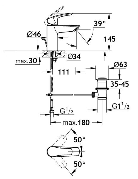 литой рычагмонтаж на одно отверстиеаэратор M 24 x 1керамический картридж с ограничителем горячей водыгибкая подводка G 1/2система быстрого монтажарычажный донный клапан 1 1/4Италия10 лет гарантии
