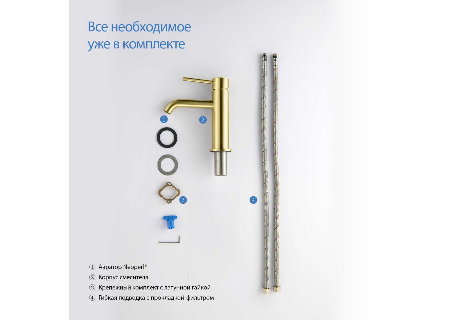 Комплект поставки • Смеситель • Гибкая подводка 60см • Ключ для снятия аэратора... Подробнее