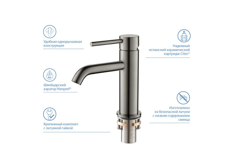 Смеситель оснащен испанским керамическим картриджем Citec, рассчитанным на 500 тыс. циклов использования и обеспечивающим плавную регулировку температуры и напора воды.