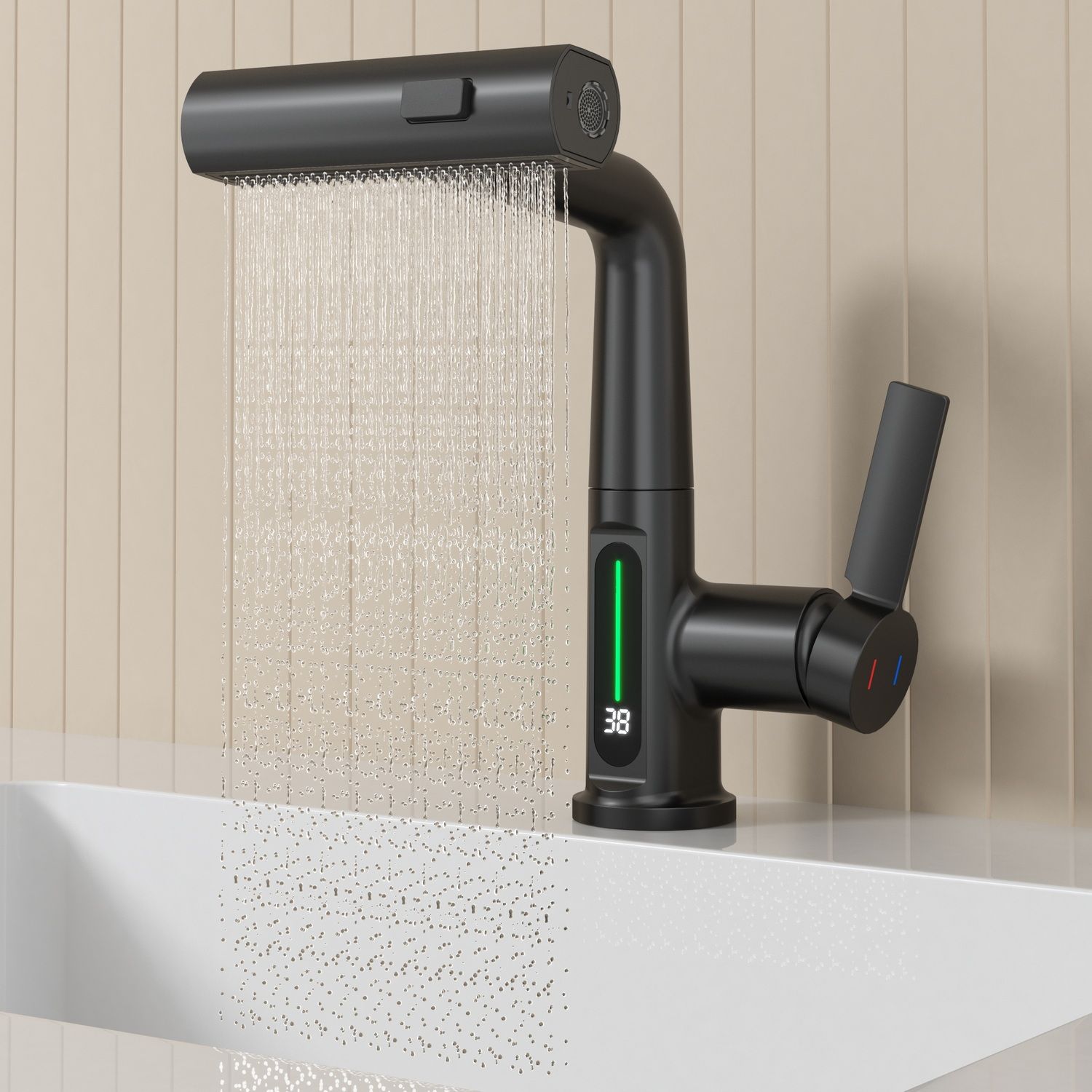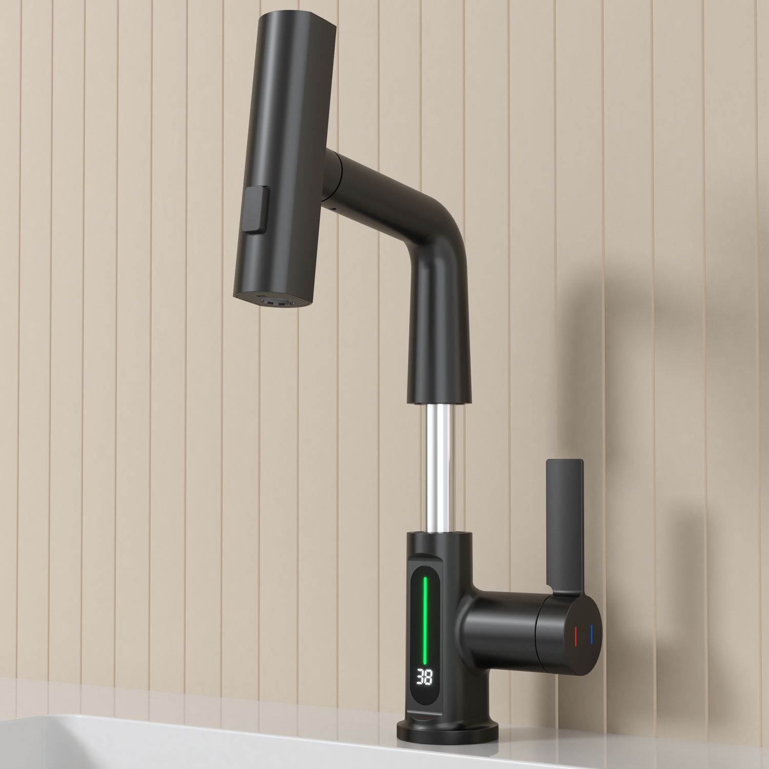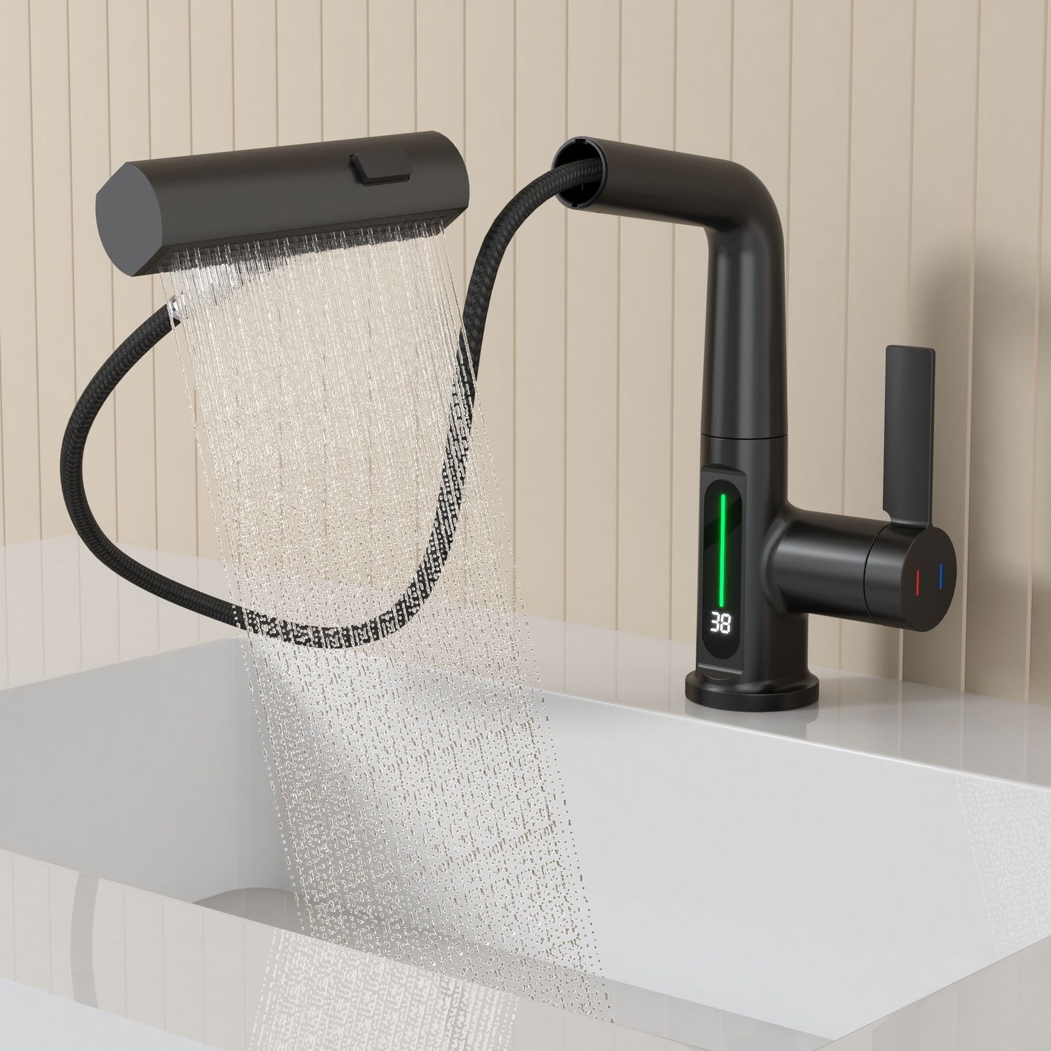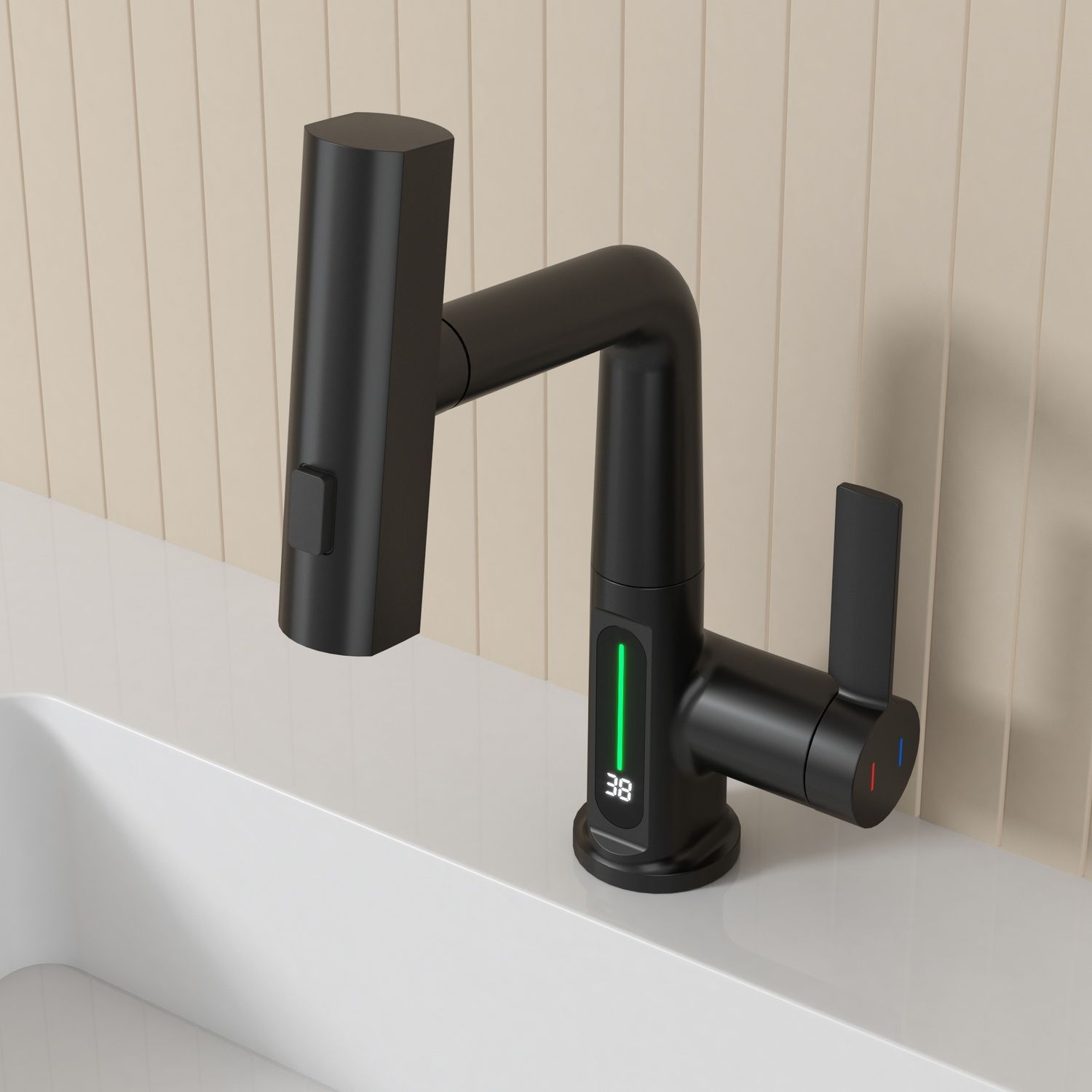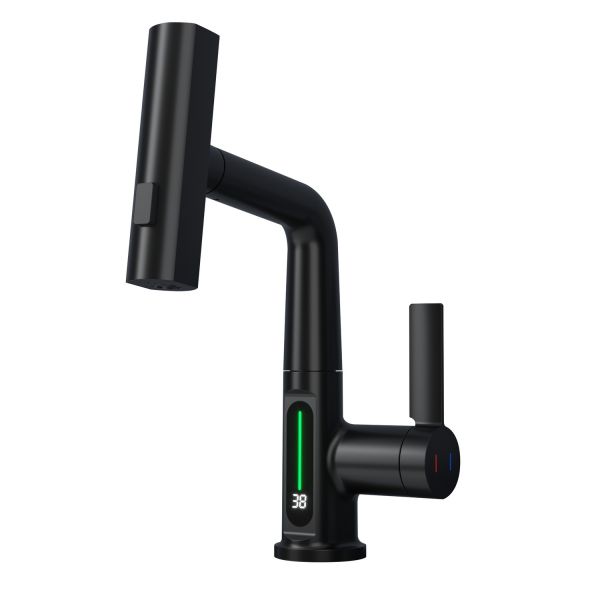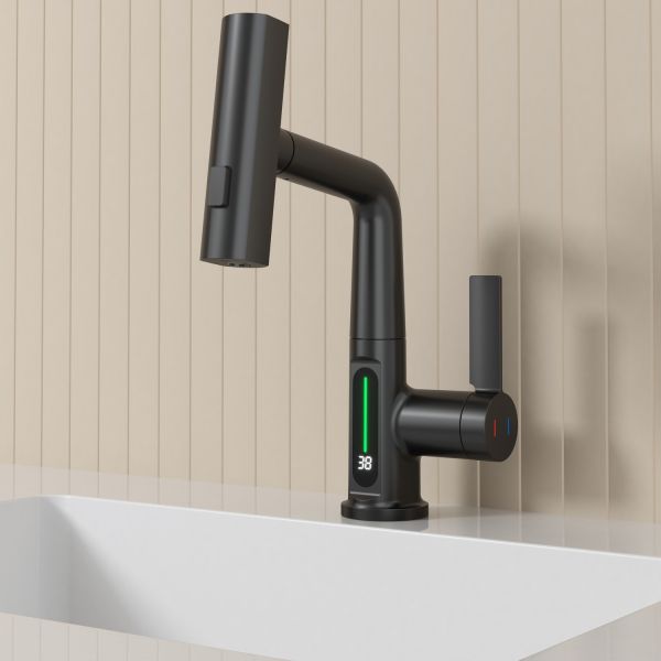 Смеситель для раковины датского производителя Black&White в черном матовом цвете. Корпус изделия выполнен из сантехнической латуни для увеличенного запаса прочности, а также исключает возможность появление коррозии. Управление потоком воды осуществляется с помощью керамического картриджа повышенной пропускной способности. Инновационным решением можно отметить электронное табло, расположенное в нижней части корпуса, на которое выводится показание температуры воды с подсветкой красного, зеленого и синего цвета. В данном продукте реализован многофункциональный излив с возможностью настройки высоты и  длинны с помощью вытяжного шланга. Аэратор смесителя оборудован несколькими видами подачи воды, которые переключаются с помощью кнопки расположенной сверху корпуса.