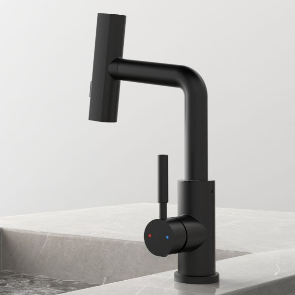 Смеситель для раковины датского производителя Black&White в черном матовом цвете. В корпусе изделия прослеживаются нотки классических форм и современного стиля. Изготавливается из сантехнической латуни для увеличенного запаса прочности и исключения вероятности появление коррозии. Управление потоком воды осуществляется с помощью керамического картриджа повышенной пропускной способности. Инновационным решением можно отметить электронное табло, расположенное в нижней части корпуса, на которое выводится показание температуры воды с подсветкой красного, зеленого и синего цвета. В данном продукте реализован многофункциональный излив с возможностью настройки высоты и длинны с помощью вытяжного шланга. Аэратор смесителя оборудован несколькими видами подачи воды, которые переключаются с помощью кнопки расположенной сверху корпуса.