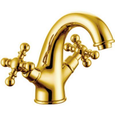 Смеситель для умывальника Gappo G1089-6 - компактная латунная модель для небольших умывальников. Напор и температура регулируются вентилями с поворотом на 180 градусов. Цвет - золото.