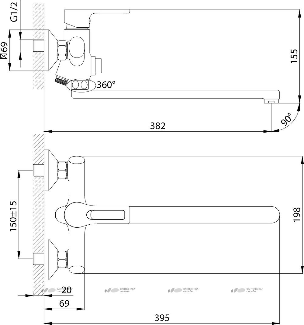 - Душевой гарнитур: металлический шланг длиной 150 см, настенное крепление, 3-функциональная лейка с функцией легкой очистки.
