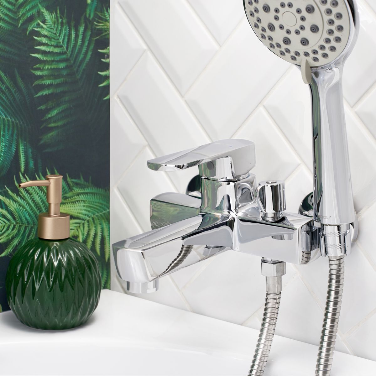 В комплекте удобная трехрежимная лейка с гибким шлангом и настенный держатель.
