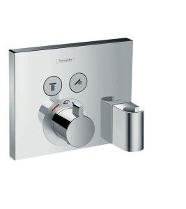 Термостат ShowerSelect, для 2 потребителей Hansgrohe Select 15765000 Характеристики продукта:-2 потребителя-возможно одновременное включение нескольких потребителей (душей)-кнопка Select включения / выключения для 2 потребителей-предохранительный ограничитель при 40°C-расход воды через верхний вывод: 29 л/мин-встроенный держатель душаСмеситель Hansgrohe Select 15765000 для душа с термостатомНеобходимо приобрести скрытую часть 01800180