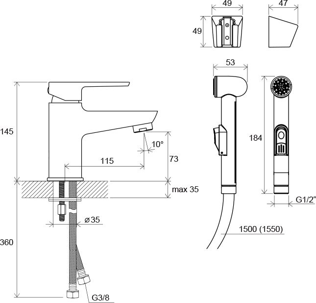 - исполнение: с ручным гигиеническим душем и держателем для стены