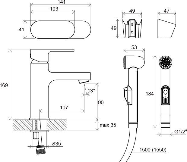 - исполнение: с ручным гигиеническим душем и настенным держателем