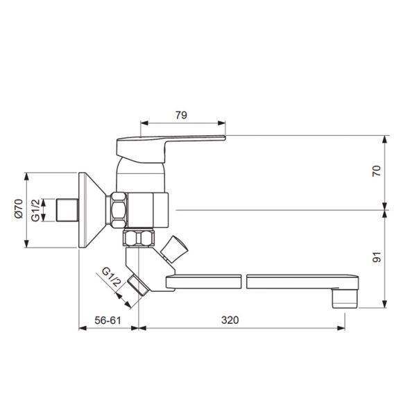LOGIK Настенный смеситель для ванны/душа, поворотный излив 320 мм, душевой гарнитур в комплекте (лейка 70 мм, метал.шланг 1500 мм, держатель для лейки).