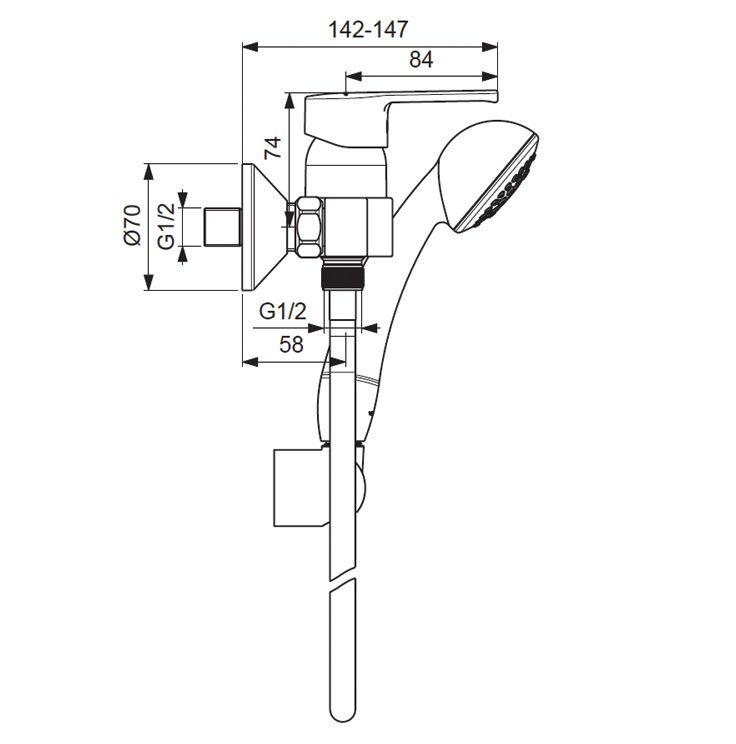 UNO Настенный смеситель для душа, душевой гарнитур в комплекте (душевая лейка 70 мм, металлический шланг 1500 мм, держатель для лейки).Смеситель однорычажный