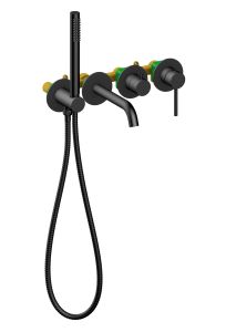 Черная сантехника становится все более популярной для ванных комнат из-за способности расставлять акценты. Встраиваемый смеситель Timo Saona 2314 предназначен для монтажа в твердой или полой стене. Уникальная дизайнерская модель с раздельными горизонтальными блоками, создаст неповторимый современный интерьер в ванной комнате. Основные преимущества встроенного смесителя: коммуникации, крепления и механизмы спрятаны в стену и видны только декоративные элементы, установить встроенный смеситель можно в любом месте. Стильная лейка-карандаш удобна в использовании и фиксируется в держателе с подключением душа. Регулировка температуры и напора воды осуществляется джойстиком справа. Переключение потока воды с излива на ручную лейку осуществляется поворотом ручки дивертора. Сложностей монтажа не возникает при установке смесителя опытным сантехником. Внимательно изучите инструкцию по монтажу и эксплуатации. Черная сантехника требует бережного ухода.
