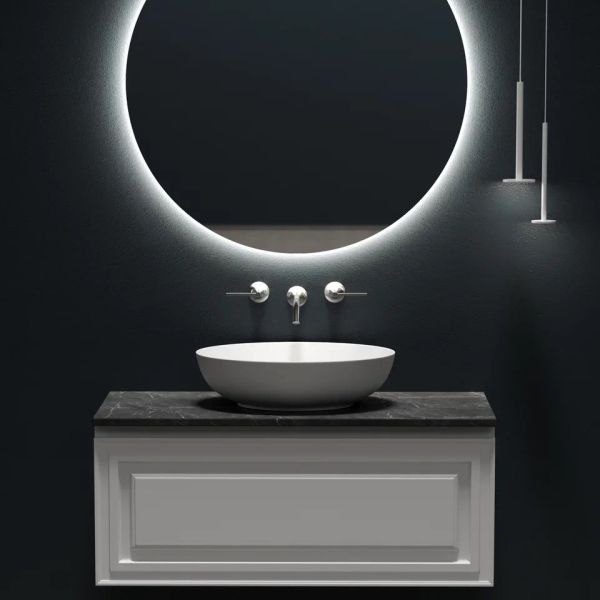 Столешница для ванной комнаты из керамогранита, для установки на подвесную тумбу. C готовым отверстием для установки накладной раковины. Без заранее просверленного отверстия под смеситель.