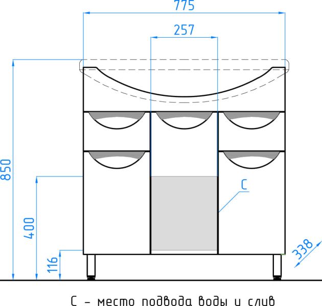 Тумба напольная бренда "Style Line" коллекции "Жасмин" со стильными врезными ручками. Фурнитура - хром, направляющие полного выдвижения Hettich; сборка изделия с помощью эксцентриковых стяжек Hafele; все материалы полностью влагостойкие. Данная тумба предусматривает открытую подводку воды