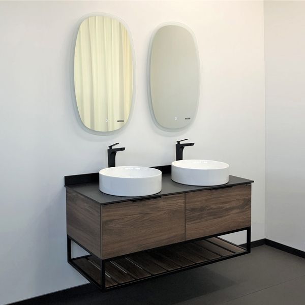 Подвесная тумба-умывальник с двумя выкатными ящиками с плавным закрыванием, столешницей из черного керамогранита и двумя круглыми раковинами-чашами.