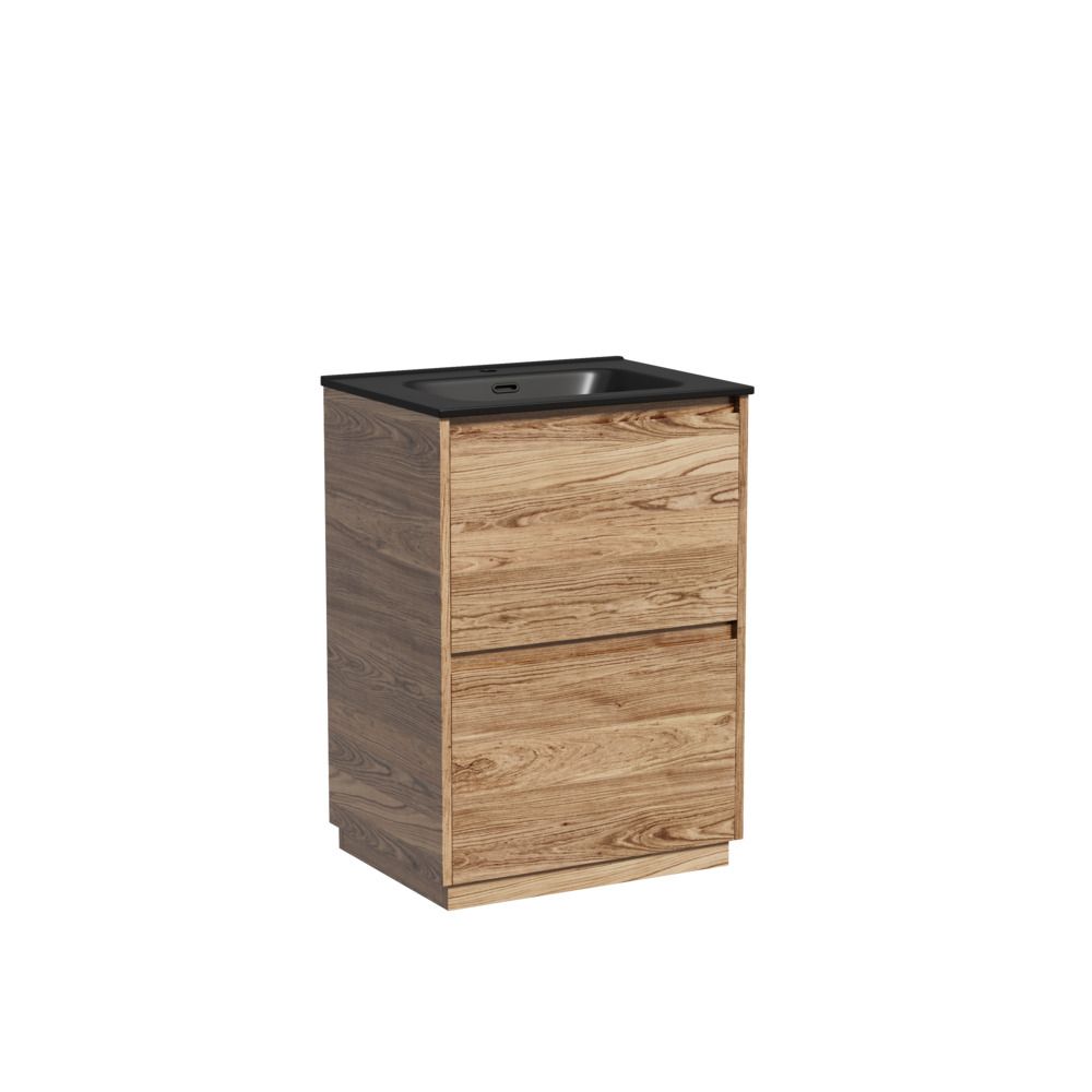 Тумба напольная Libra c двумя ящиками с доводчиками скрытого монтажа, с системой плавного закрывания и с ручкой по всей длине ящика. Каркас и фасад тумбы выполнен из ЛДСП в цвете «дуб чарльстон». Покрытие - ламинат. Основание тумбы имеет ножки c регулировкой высоты до10 мм для компенсации возможной неровности напольного покрытия. Внутреннее пространство тумбы выполнено из надежного ЛДСП серого цвета. Размер 590х450х840, артикул LB60FECH.