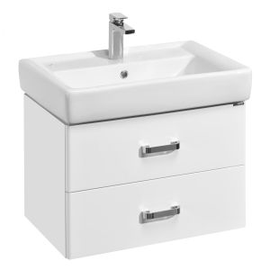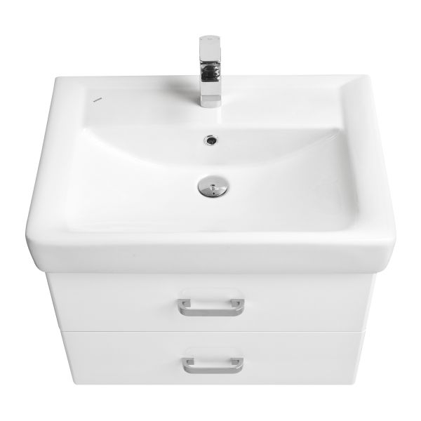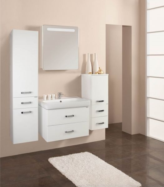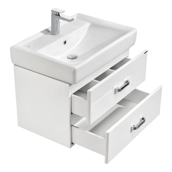 Стильная лаконичная модель, созданная для небольших ванных комнат. В тумбе имеются два ящика, изготовленные из декоративной влагостойкой ДСП. Верхний ящик имеет специальную организацию пространства, позволяющую хранить мелкие предметы, а нижний широкий и вместительный для более крупных предметов.
