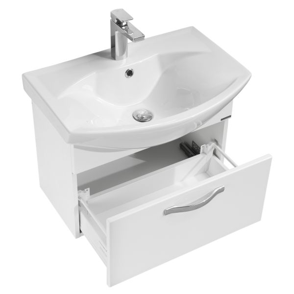 В тумбе за фасадом расположен ящик из влагостойкой ДСП со вставками, организующими его пространство. Ящик установлен на направляющие полного выдвижения немецкого производителя фурнитуры GRASS, благодаря чему им удобно пользоваться даже с керамической раковиной, выступающей вперед.Тумба для комплекта Акватон Ария 65 белая не только не только функциональный предмет интерьера ванной комнаты, но превосходное эргономичное дополнение дизайна, как небольшого, так и крупного помещения. Подвесной способ установки дает возможность не только визуально увеличить пространство, но и обеспечивает быстрый и удобный доступ для уборки.Компания Акватон использует при производстве высококачественные водоотталкивающие материалы (ДСП), соответствующие всем необходимым требованиям безопасности. Коллекция Ария выполнена в эксклюзивном дизайнерском решении в лучших традициях современного стиля. Белый, основной цвет исполнения Акватон Ария, отлично подходящий большинству дизайнерских решений. Тумба под раковину предусматривает удобную и вместительную систему хранения, состоящую из ящиков. Качественные доводчики позволяют обеспечить мягкое и тихое закрывание. Важные габариты изделия: ширина 59.4 см, глубина 31 см, высота 44.2 см.Россия родина бренда Акватон, вся продукция производится со строгим соблюдением всех стандартов, благодаря чему можно быть абсолютно уверенным в надежности и высоком качестве. Тумба для комплекта Акватон Ария 65 белая создаст уют и комфорт в любом дизайнерском решении, и ванная комната обретет неповторимый элемент интерьера.