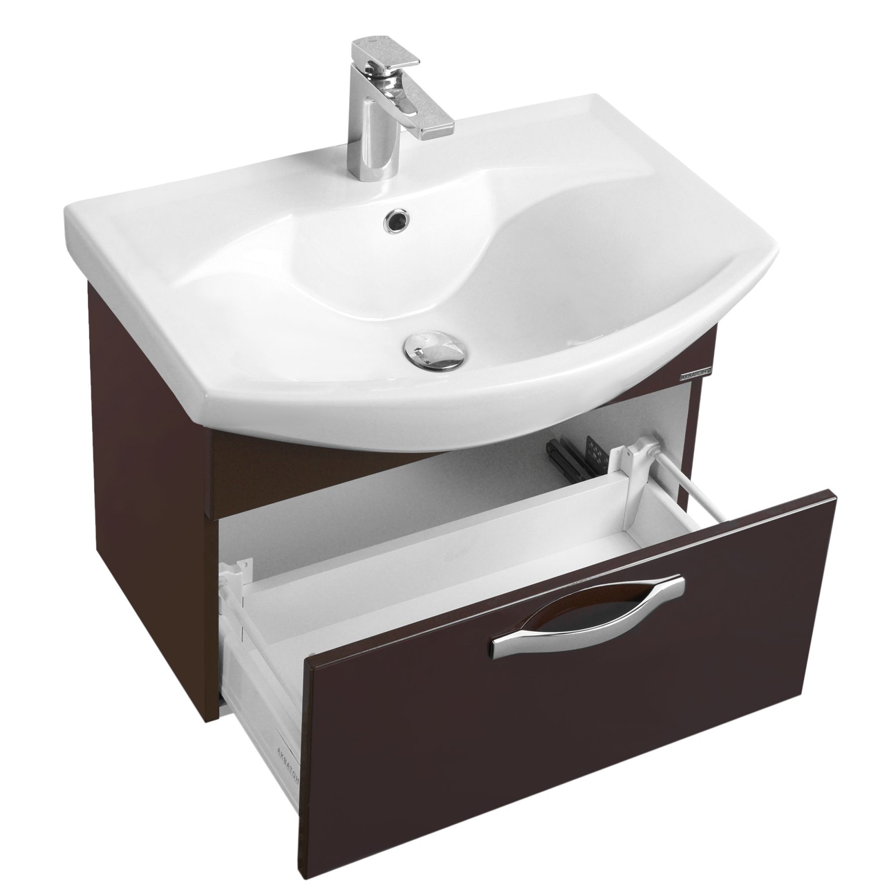 В тумбе за фасадом расположен ящик из влагостойкой ДСП со вставками, организующими его пространство. Ящик установлен на направляющие полного выдвижения немецкого производителя фурнитуры GRASS, благодаря чему им удобно пользоваться даже с керамической раковиной, выступающей вперед.Тумба для комплекта Акватон Ария 65 темно-коричневая не только не только функциональный предмет интерьера ванной комнаты, но прекрасное эргономичное дополнение дизайна, как небольшого, так и крупного помещения. Подвесной способ установки дает возможность не только визуально увеличить пространство, но и обеспечивает быстрый и удобный доступ для уборки.Компания Акватон использует при производстве высококачественные водоотталкивающие материалы (ДСП), соответствующие всем необходимым требованиям безопасности. Серия Ария отличается превосходным дизайном с соблюдением всех значимых элементов современного стиля. Основным цветом, в котором выполнена тумба под раковину Акватон Ария является коричневый, отлично подходящий большинству дизайнерских решений. Тумба под раковину предусматривает удобную и вместительную систему хранения, состоящую из ящиков. Качественные доводчики позволяют обеспечить мягкое и тихое закрывание. Важные размеры товара: ширина 59.4 см, глубина 31 см, высота 44.2 см.Страной бренда Акватон является Россия, все товары производятся с выполнением соответствующих стандартов качества, что позволяет быть полностью уверенными в долговечности и надежности. Тумба для комплекта Акватон Ария 65 темно-коричневая правильный выбор в современном дизайне ванной, придающий уникальность всему помещению, при этом сохраняя функциональность.