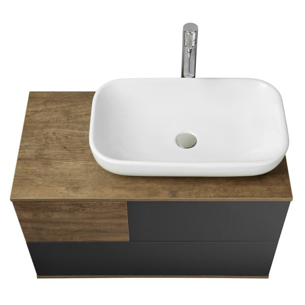 • Текстуры на тумбе Терра 85 расположены ассиметрично: столешница, корпус и вставка на верхнем ящике - влагостойкое ДСП с текстурой дуб кантри, фасады ящиков - матовая серая пленка антрацит