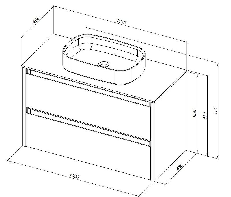 Габариты корпуса тумбы (ШхВхГ): 1000х620х460 мм.