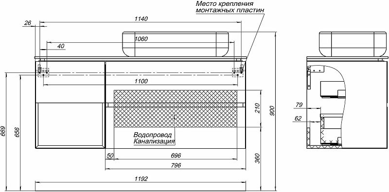 Габариты корпуса тумбы (ШхВхГ): 1192х510х456 мм.