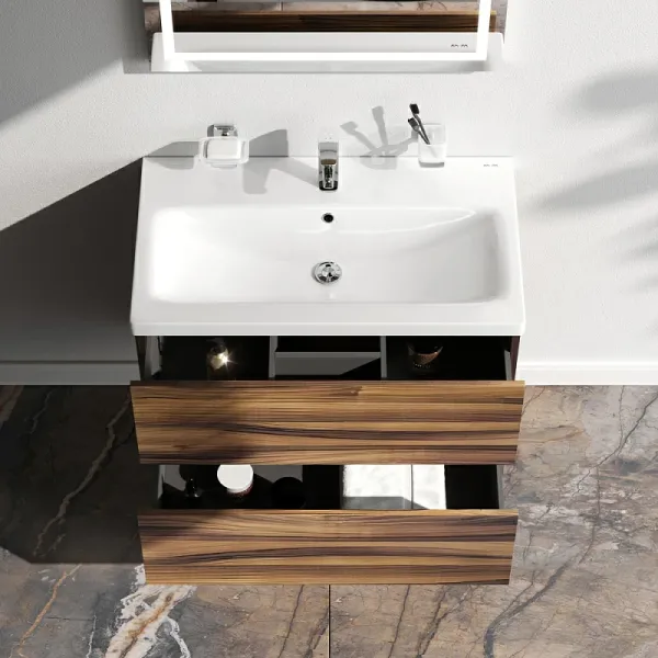 подвесная тумба помогает сэкономить место в ванной комнате, визуально увеличивая пространство;