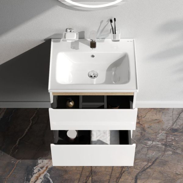 Подвесная тумба помогает сэкономить место в ванной комнате, визуально увеличивая пространство. Установка на удобной высоте. Оптимизация хранения вещей внутри ящиков. Грамотно расположенные скрытые коммуникации внутри тумбы. Бортик по контуру раковины препятствует проливу воды за мебель. Сантехнический фарфор - долговечный и прочный материал, обладающий высокой гигиеничностью.