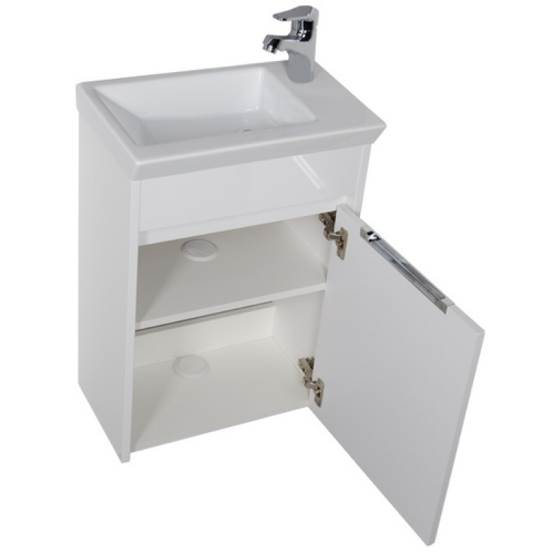 В тумбе предусмотрены просторные полки, а столешницей служит глубокая прямоугольная керамическая раковина. Отверстие под смеситель для удобства расположен по правую руку.