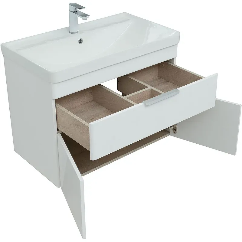 Особое внимание уделено безопасности: скругленные углы раковины и мебели минимизируют риск травм, что особенно важно в семьях с детьми. Направляющие скрытого монтажа с доводчиком обеспечивают плавное и бесшумное закрытие дверец, что добавляет комфорта в повседневное использование.