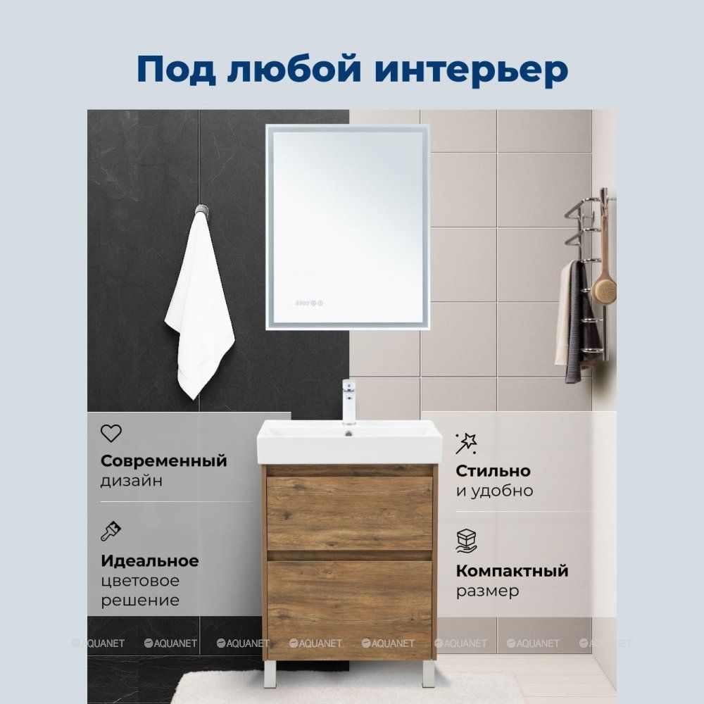 Стильная и практичная тумба для ванной комнаты с продуманной конструкцией. Модель Aquanet Nova Lite 2.0 60 выполнена в цвете дуб рустикальный – матовое покрытие имитирует фактуру натурального дерева и не оставляет отпечатков пальцев.