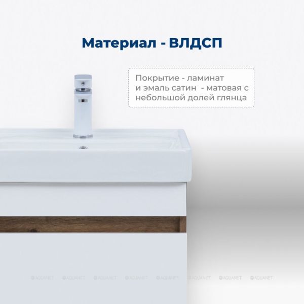 Корпус тумбы выполнен из влагостойкой ЛДСП с ламинированным покрытием, что гарантирует долговечность и устойчивость к воздействию влаги. Фасады также изготовлены из влагостойкой ЛДСП, обеспечивая единый стиль и надежную защиту от деформации.
