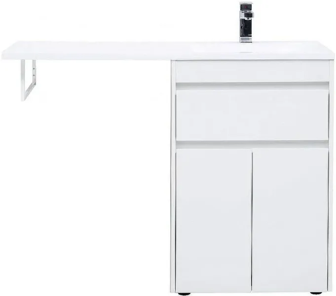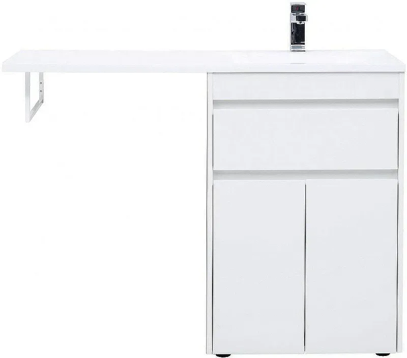 Тумба под раковину Aquanet Токио 120 (напольная, 1 ящик, 2 дверцы) белого цвета представляет новый формат тумб производства Aquanet. Раковина из литьевого мрамора имеет длинную платформу, которая выходит далеко за пределы тумбы. Она предназначена для того, чтобы установить с левой стороны от тумбы стиральную машину. Платформа имеет такую длину, которая позволит спрятать под нее машинку средних размеров с фронтальной загрузкой. Корпус тумбы выполнен из влагостойкого ЛДСП, а фасады – из МДФ с покрытием эмалью. Разнообразные зоны хранения в тумбе шириной 580 мм скрыты в ящике и за распашными дверками. Тумбу можно использовать и без соседства со стиральной машиной, а свободное пространство под платформой раковины занять подкатной тумбой, приспособлениями для уборки помещения или столиком. Тумба предлагается без раковины