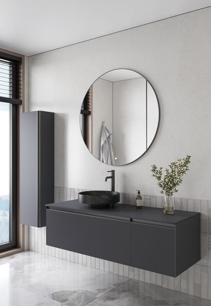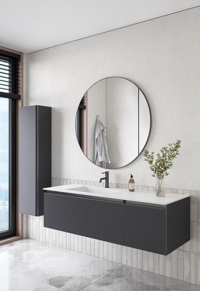 Главной особенностью коллекции являются обрамления фасадов из алюминия в самых трендовых цветах: графит, матовое золото, матовый черный и серебро. Эти обрамления идеально дополняют сантехнику в ванной комнате.